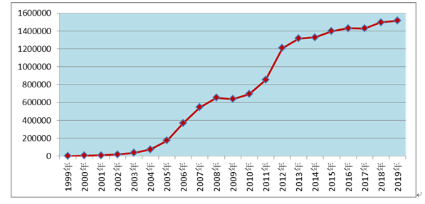 圖1 1999年-2019年全國藥品不良反應/事件報告數量增長趨勢