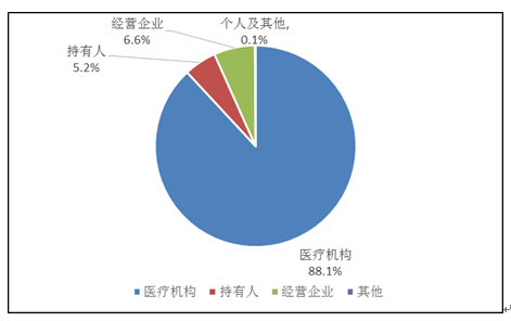 持有人、經營企業(yè)和醫(yī)療機構是藥品不良反應報告的責任單位。按照報告來源統(tǒng)計,2019年來自醫(yī)療機構的報告占88.1%;來自經營企業(yè)的報告占6.6%;來自持有人的報告占5.2%;來自個人及其他報告者的報告占0.1%(圖3)。