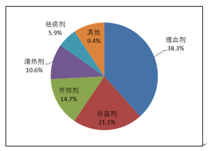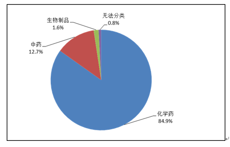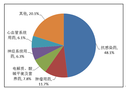 按照藥品類別統(tǒng)計,化學藥品占86.6%,中藥占12.6%,生物制品占0.8%。化學藥品排名居前的藥品類別是抗感染藥、心血管系統(tǒng)用藥、腫瘤用藥、神經系統(tǒng)用藥、電解質、酸堿平衡及營養(yǎng)藥;中藥排名居前的藥品類別是理血劑、補益劑、祛濕劑、開竅劑、清熱劑。