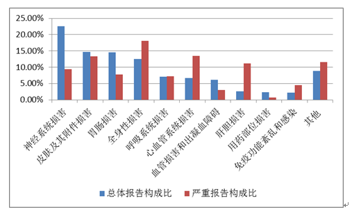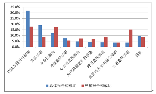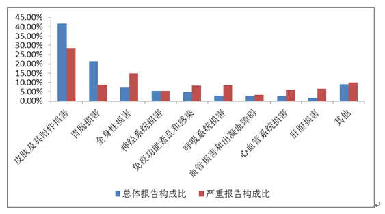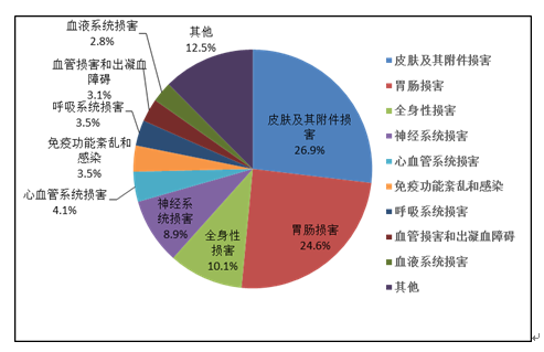 2019年國家基本藥物化學藥品和生物制品不良反應/事件報告,按照藥品類別統(tǒng)計,報告數量排名前5位的分別是抗微生物藥、心血管系統(tǒng)用藥、抗腫瘤藥、激素及影響內分泌藥、治療精神障礙藥;累及器官系統(tǒng)排名前5位的是皮膚及其附件損害、胃腸損害、全身性損害、神經系統(tǒng)損害以及血液系統(tǒng)損害。
